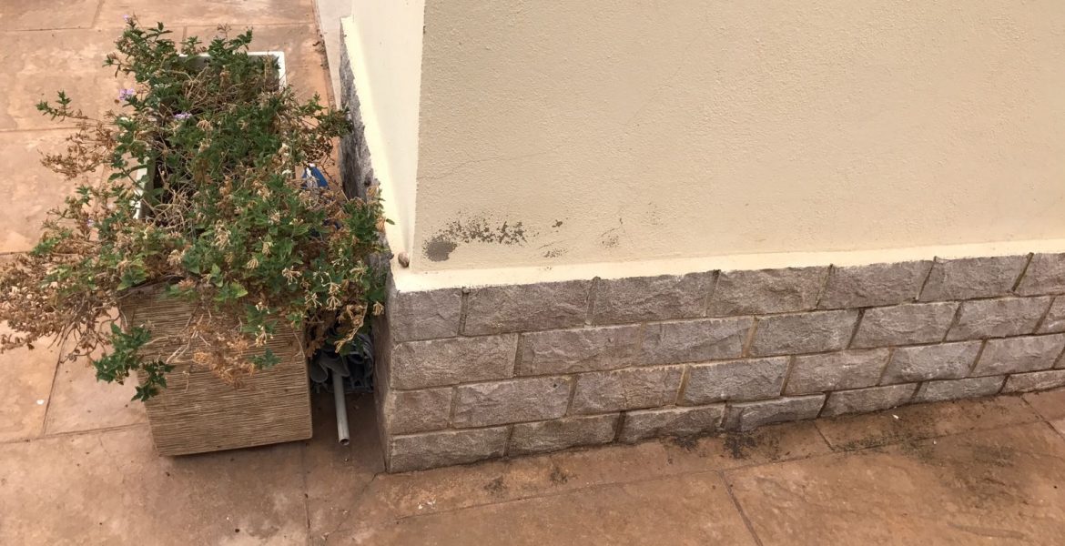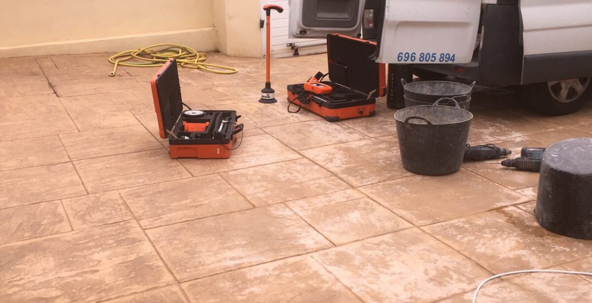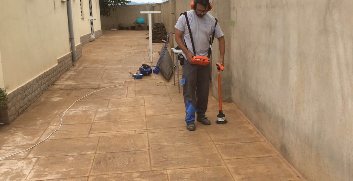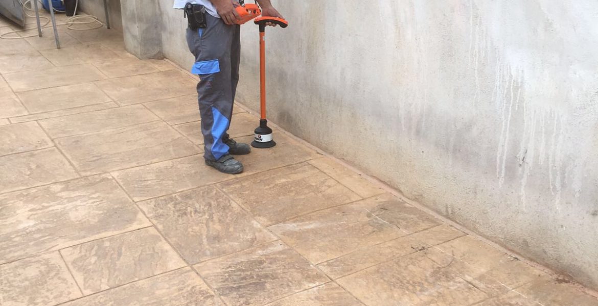 Localización de fuga de agua, reparación instalando arquetas de registro, hormigón impreso y trabajos de pintura en siniestro atendido en Castellón.