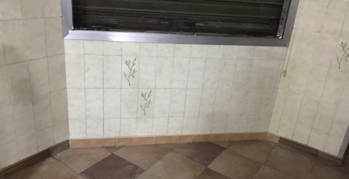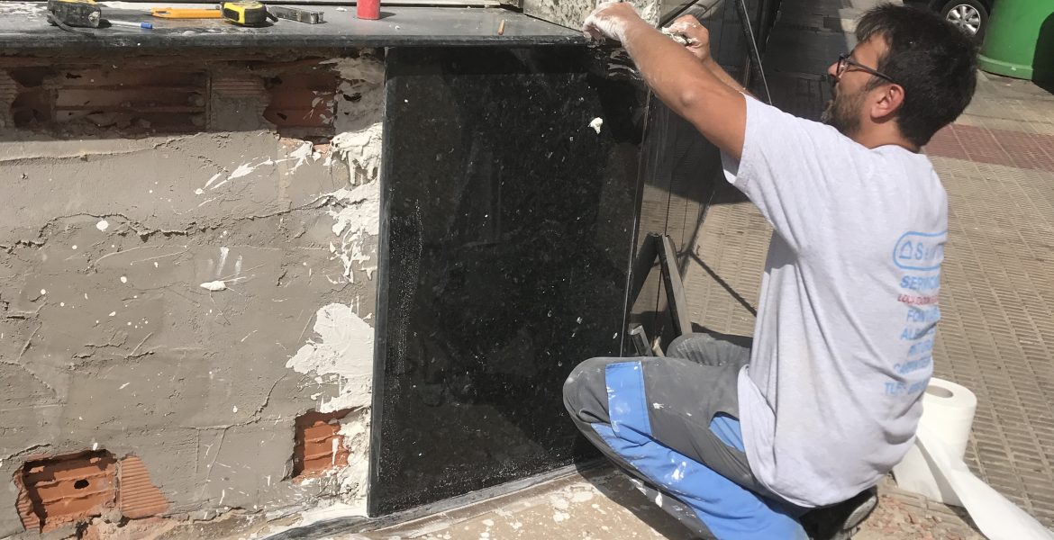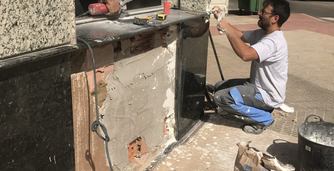 Trabajos de albañilería para reparar los desperfectos producidos por un vehículo al impactar contra la fachada de un conocido bar-restaurante de Castellón.